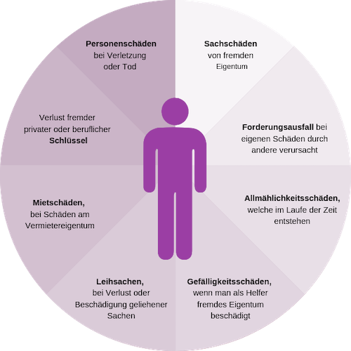 Esiste un obbligo legale di risarcimento danni . Questo è regolato dal Codice Civile e stabilisce: chiunque causi un danno a un'altra persona deve risarcirlo integralmente. Pertanto, sei responsabile con tutto il tuo reddito attuale e futuro, il che può avere gravi conseguenze finanziarie in caso di lesioni personali gravi se non sei assicurato. Se un oggetto viene distrutto o danneggiato, devi rimborsarne il valore di mercato attuale. La parte lesa non dovrebbe beneficiare di una situazione migliore rispetto a prima.